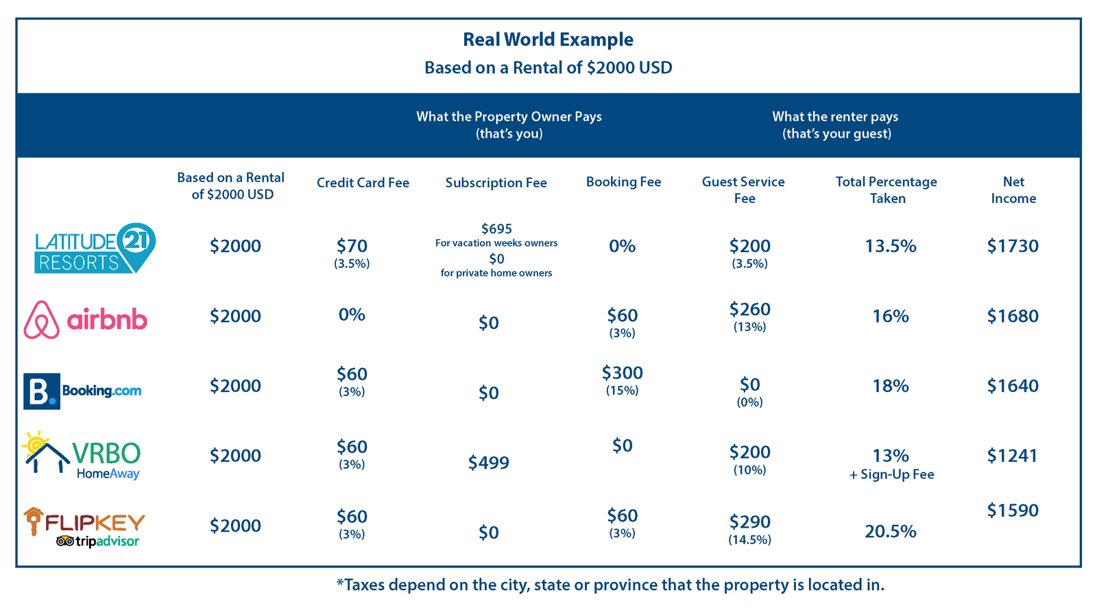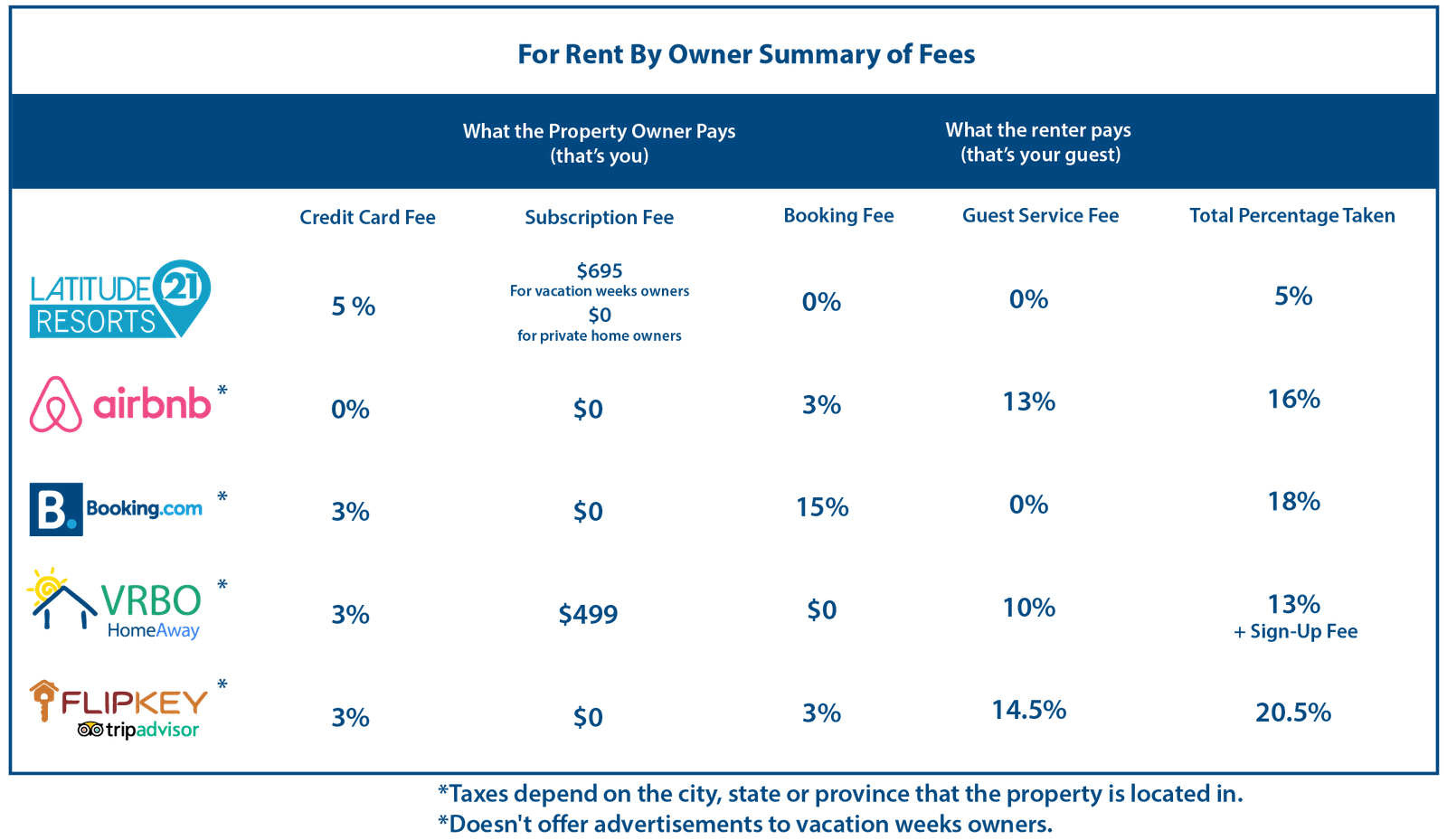 Another good question! We charge a 3.5% credit card processing fee to the property owner and a 10% guest service fee to the renter once your property rents out. Latitude21Resorts does not charge a booking fee.