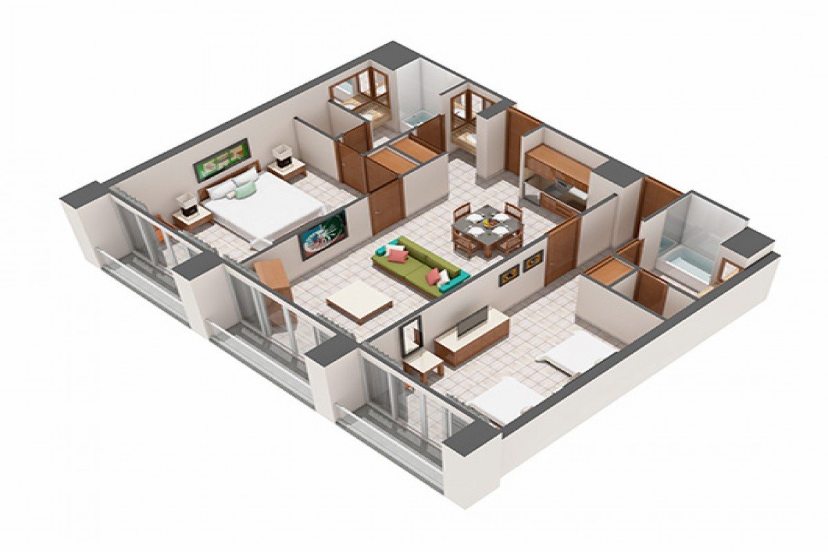 The Two Bedroom Suite features two bedrooms with a king-size bed and two double beds, plus two bathrooms. It also features a balcony, kitchen and dining table, and two TVs.