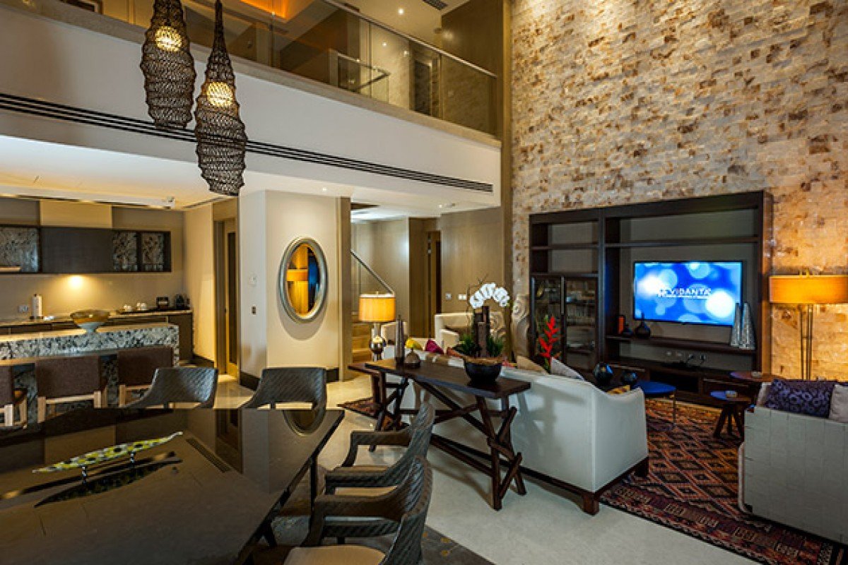 A Grand Luxxe Two Bedroom Residence Loft This gorgeous two-story space features a first floor featuring a gourmet kitchen, breakfast bar, dining table, living room, bedroom with king-size bed, bathroom with Jacuzzi tub, and laundry room with washer and dryer. The terrace includes a plunge pool, dining table, daybed, and two armchairs. The unit’s second floor offers a TV area, full guest bathroom, bedroom with king-size bed, and bathroom with a Jacuzzi tub. This unit also includes 3 TVs. Occupancy: 6 adults, 2 kids under 12 years old Type: Two-Bedroom Loft Bed: Two King-Size Beds Bathrooms: Three Bathrooms with Two Jacuzzi Tubs
