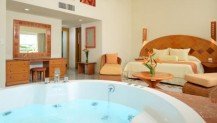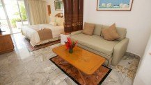 Warmly decorated suites with balconies feature kitchenettes, and seating areas with flat-screen TVs; many have lagoon or ocean views. Upgraded suites add dining areas, and some have whirlpool tubs. Room service is available.